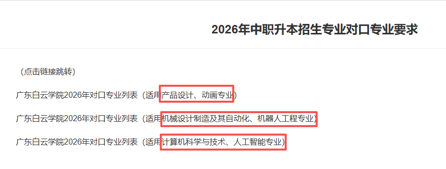 广东白云学院正在学校官网发布了2026年中职升本招生专业对口专业要求,共6个专业招生,别离是产物设想、动画、机械人工程、计较机科学取手艺、人工智能专业,本年没有新增专业。
