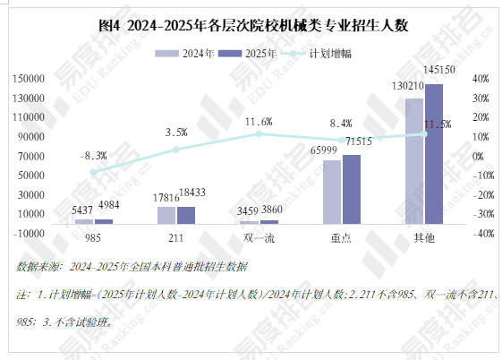 取专业点新增数量一样,机械类专业招生院校数量也履历了先削减后添加的过程,且拐点先于专业点呈现,于2022年降至687所后逐年添加,2025年共有706所院校招收该专业类。但其增速不及全国本科招生院校总数增加速度,院校占比尚未回到2021年程度。本年达到五年来最低,较2024年缩减8。3%,其他各条理院校则有3%-12%的涨幅,以更大的体量支持机械类招生总规模的抬升。近年,985院校缩减机械类专业招生规模已是常态,2021-2023年“三连降”,2024年急速回升,本年又起头下滑,大连理工大学较客岁降幅达28%、23%。虽说机械类专业有所回温,但并非大热专业,尚处于新老专业更替期间,保守专业仍是招生从力,这就导致部门院校正在招生策略调整时将更多比例投放至市场需求度更高的专业,以“机械五虎”之一华中科技大学为例,2025年机械类招生打算较上一年降幅高居各专业类第一,电子消息类专业则扩招最多。